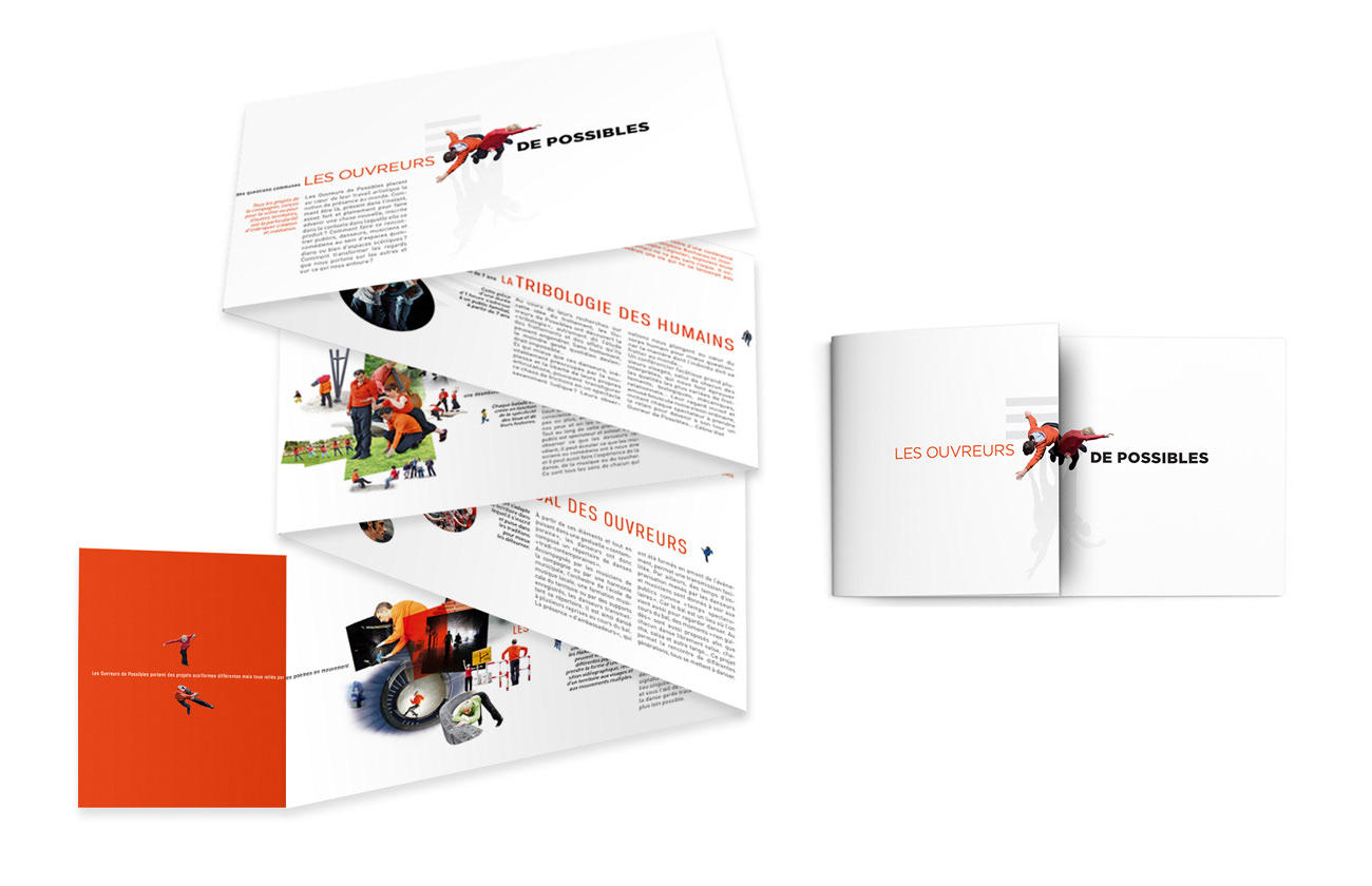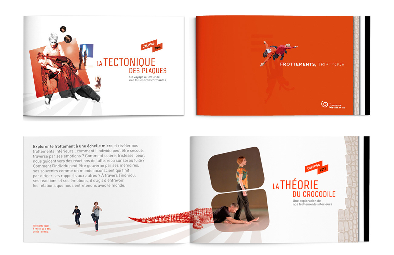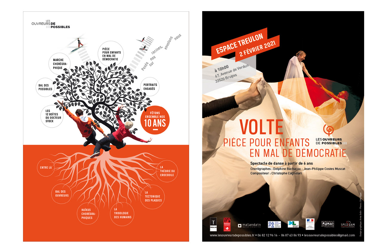 Charte graphique de la compagnie de danse contemporaine Les Ouvreurs de Possibles. Logo, affiches, flyers, brochures, création de visuels